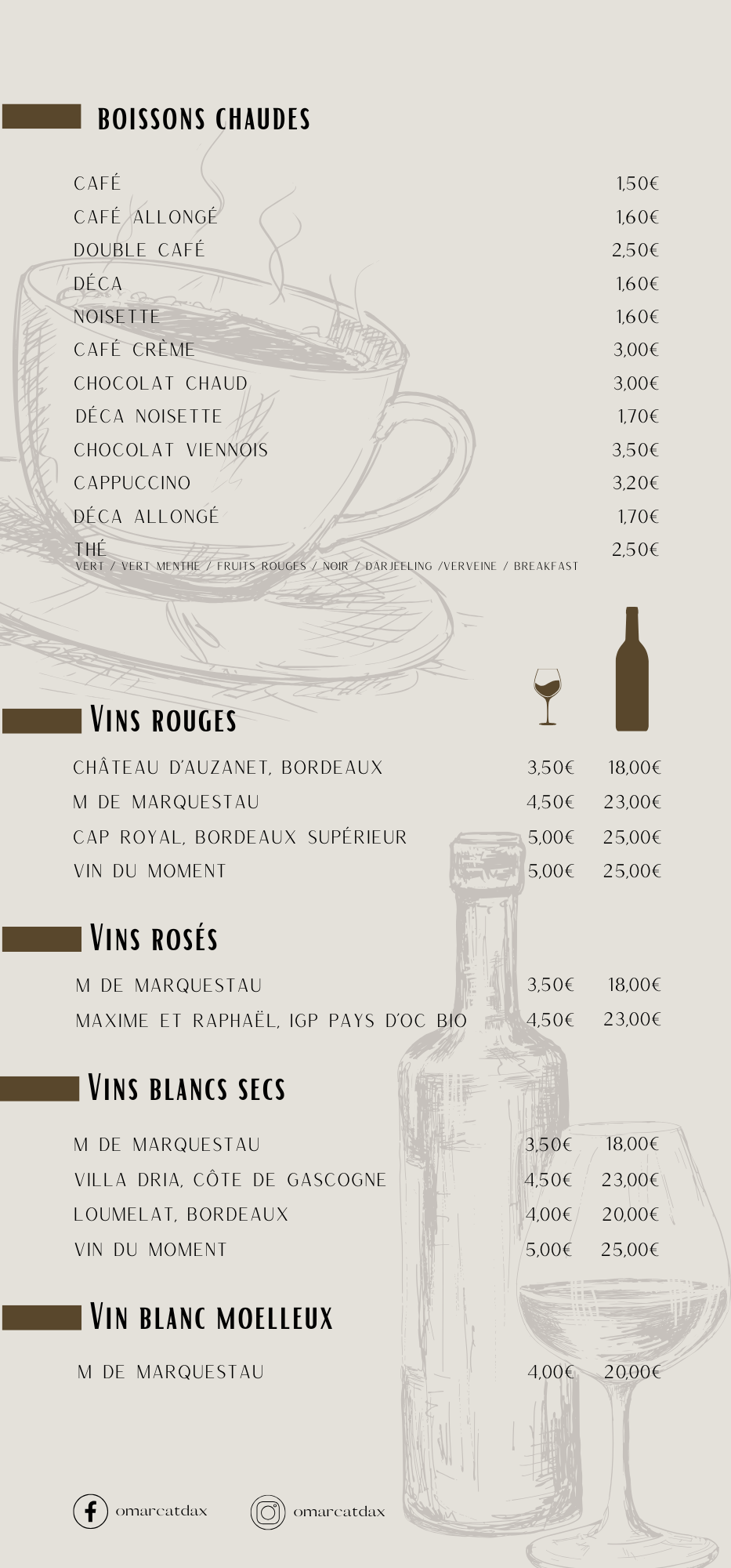 Chez Ô’Marcat, la cuisine se veut simple, gourmande et généreuse, à l’image de notre terroir landais. Nous privilégions les produits frais et de saison, directement issus du marché, pour vous offrir des plats authentiques qui mettent en valeur les saveurs locales.